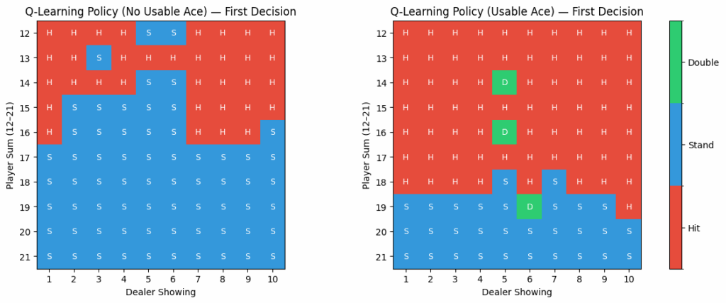 These results are in line with the theoretical house edge of ~0.5%. The difference comes from approximations and the limitations of tabular Q-learning, but the broad shape of play remains realistic.